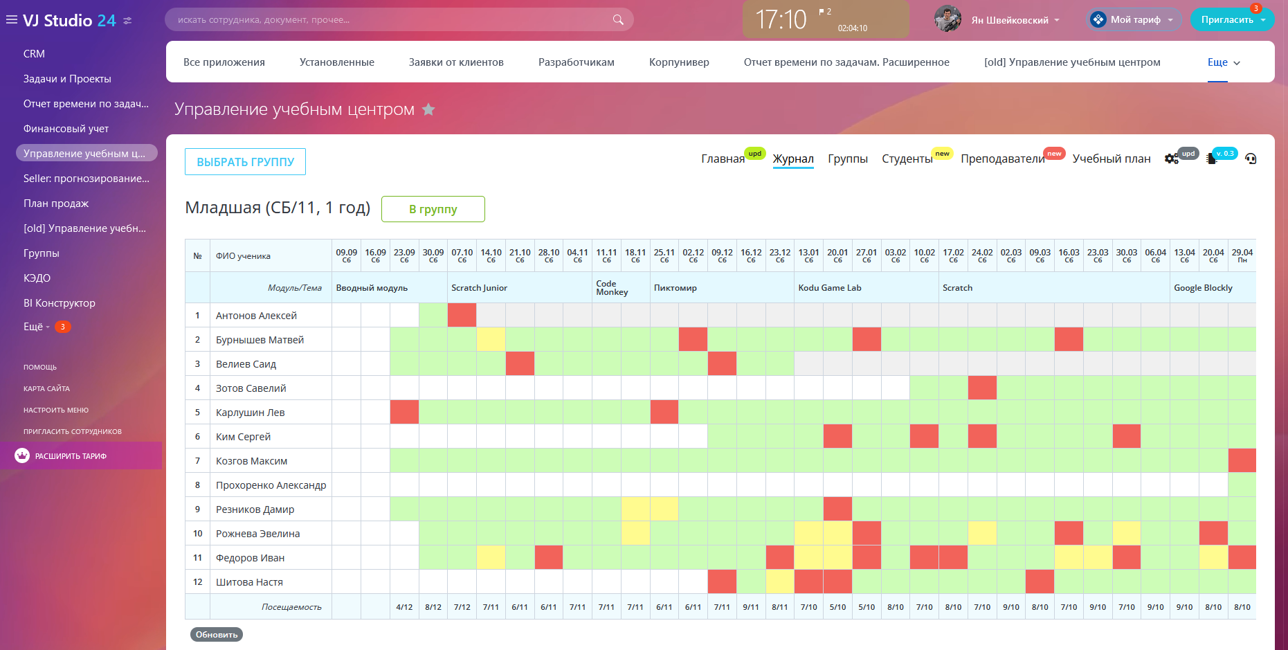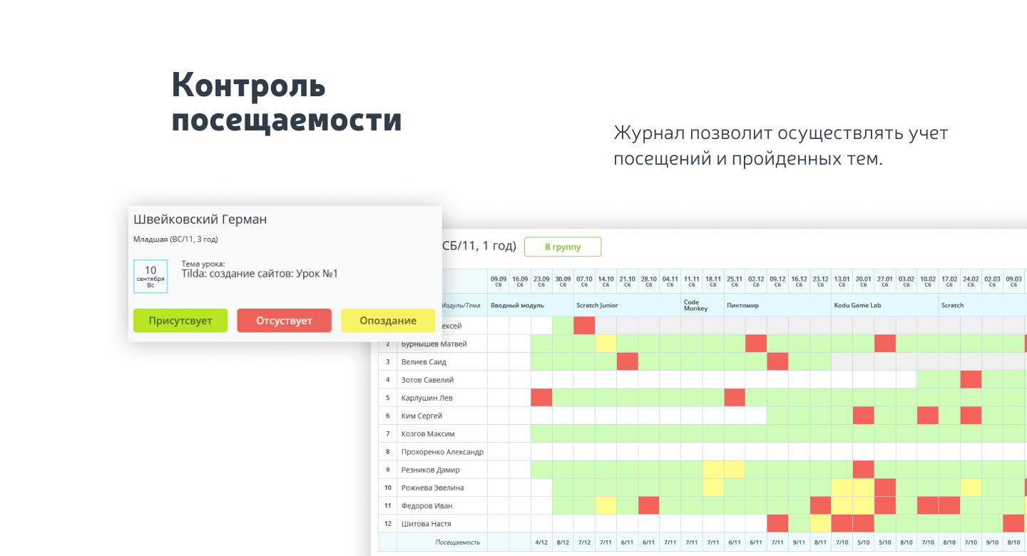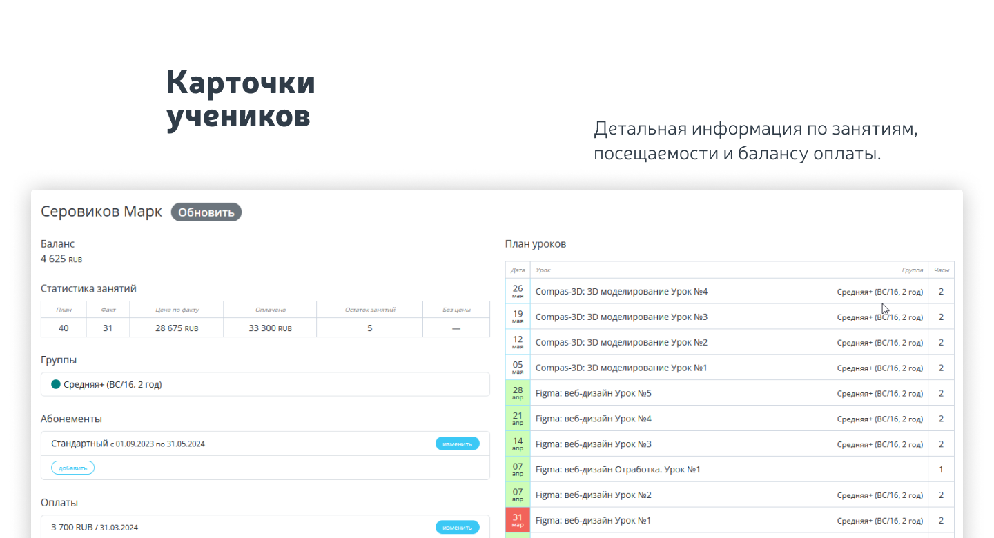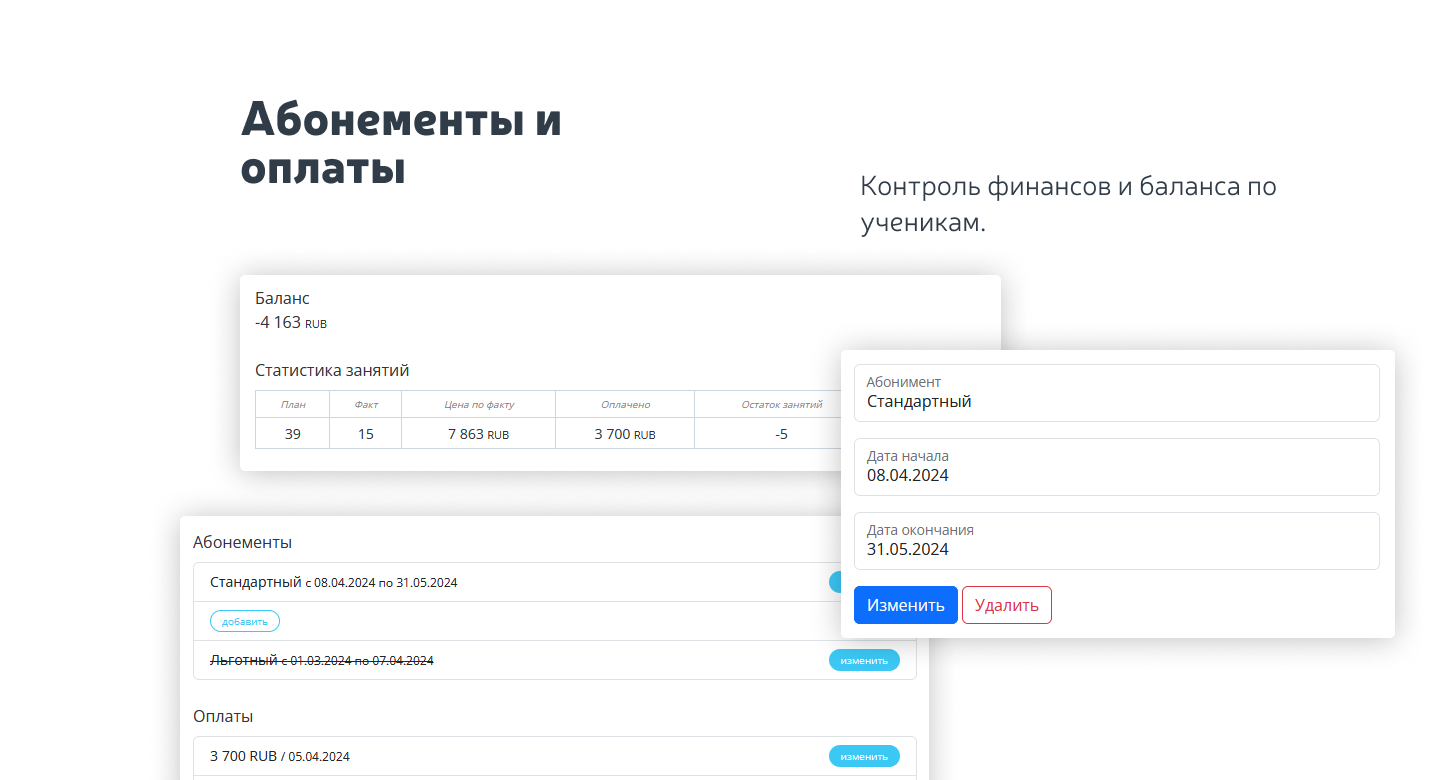 - управление посещаемостью по групповым и индивидуальным занятиям;