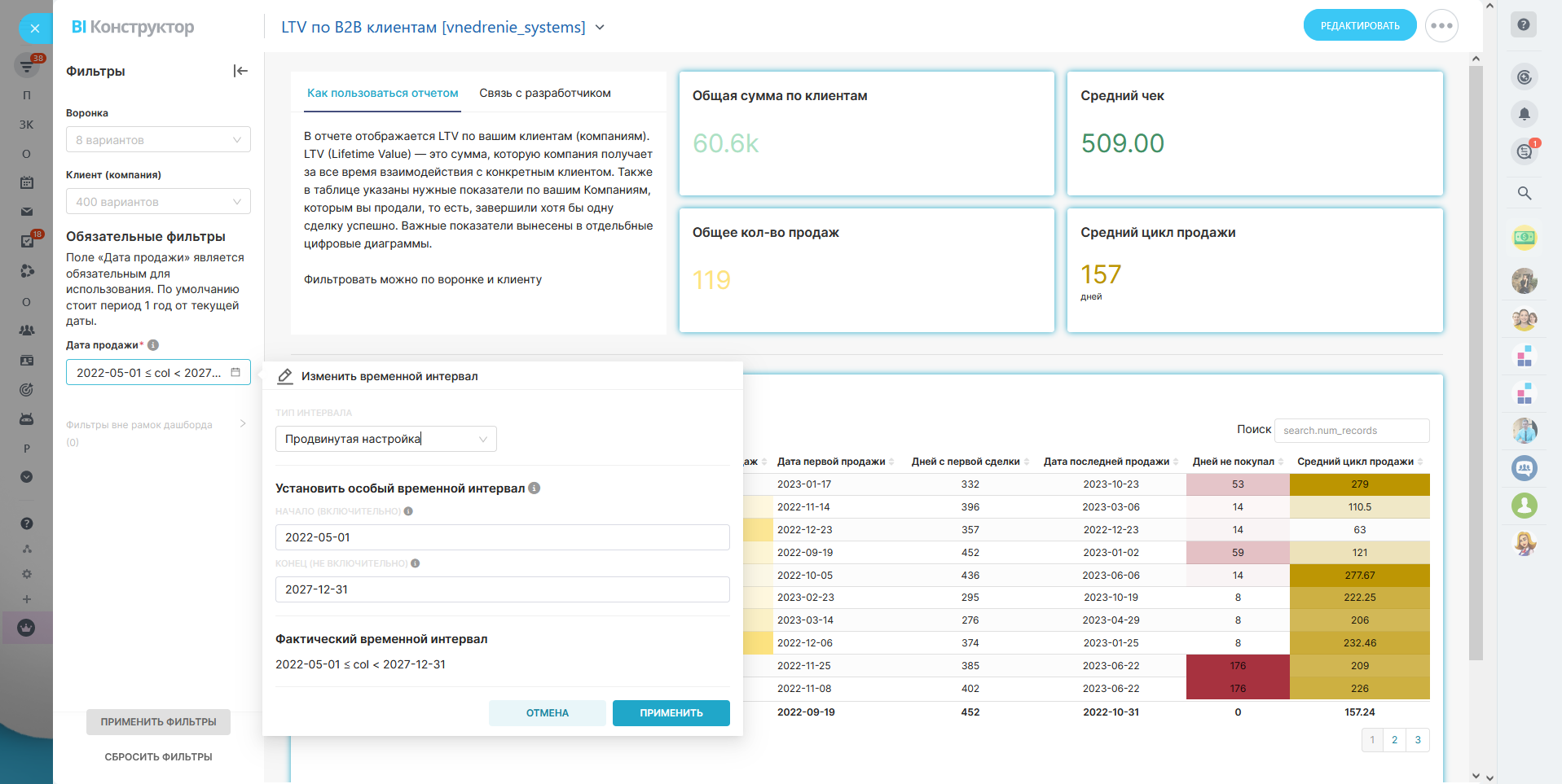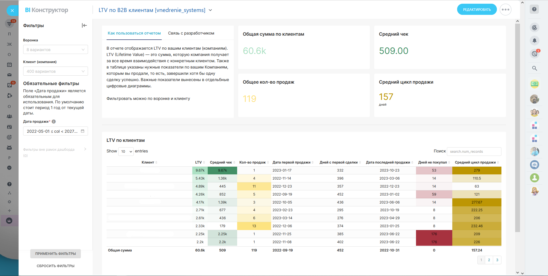 Отслеживайте показатель LTV по всем вашим клиентам. Отчет предназначен для B2B компаний с большим циклом сделки. Отчет показывает показатель LTV по всем сделкам, где клиентом указана компания.