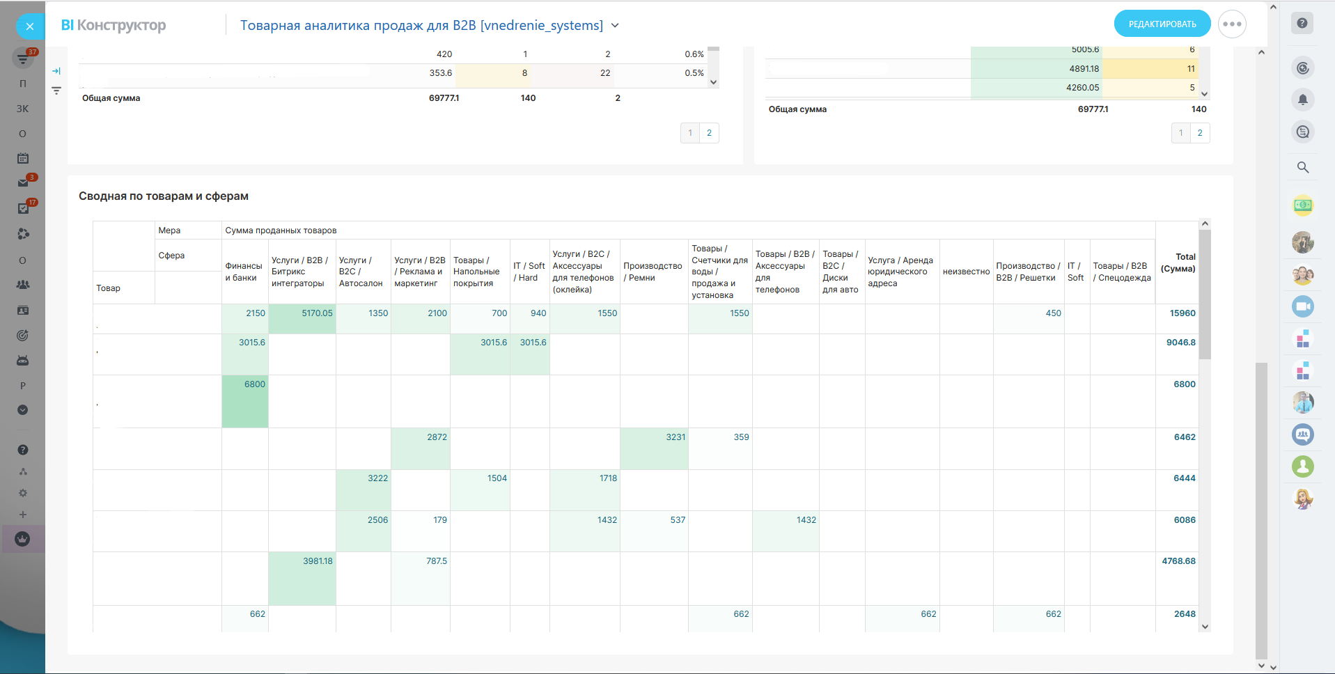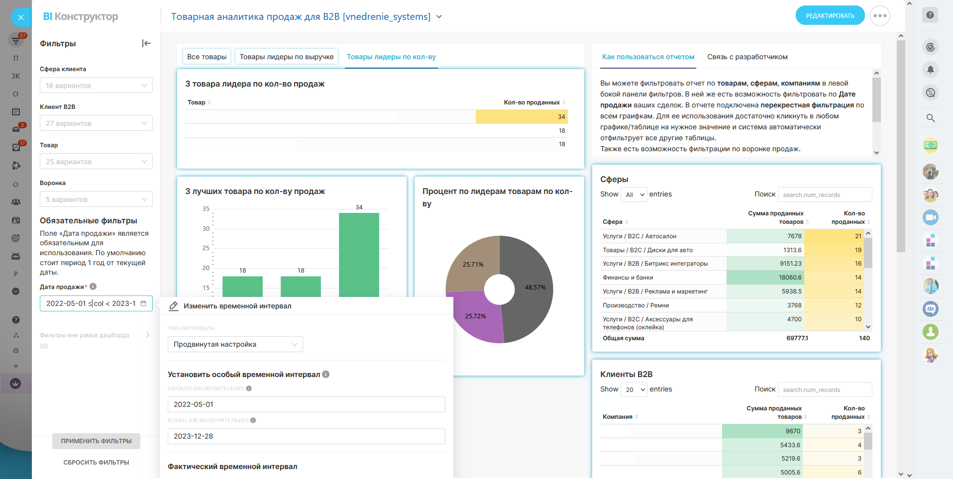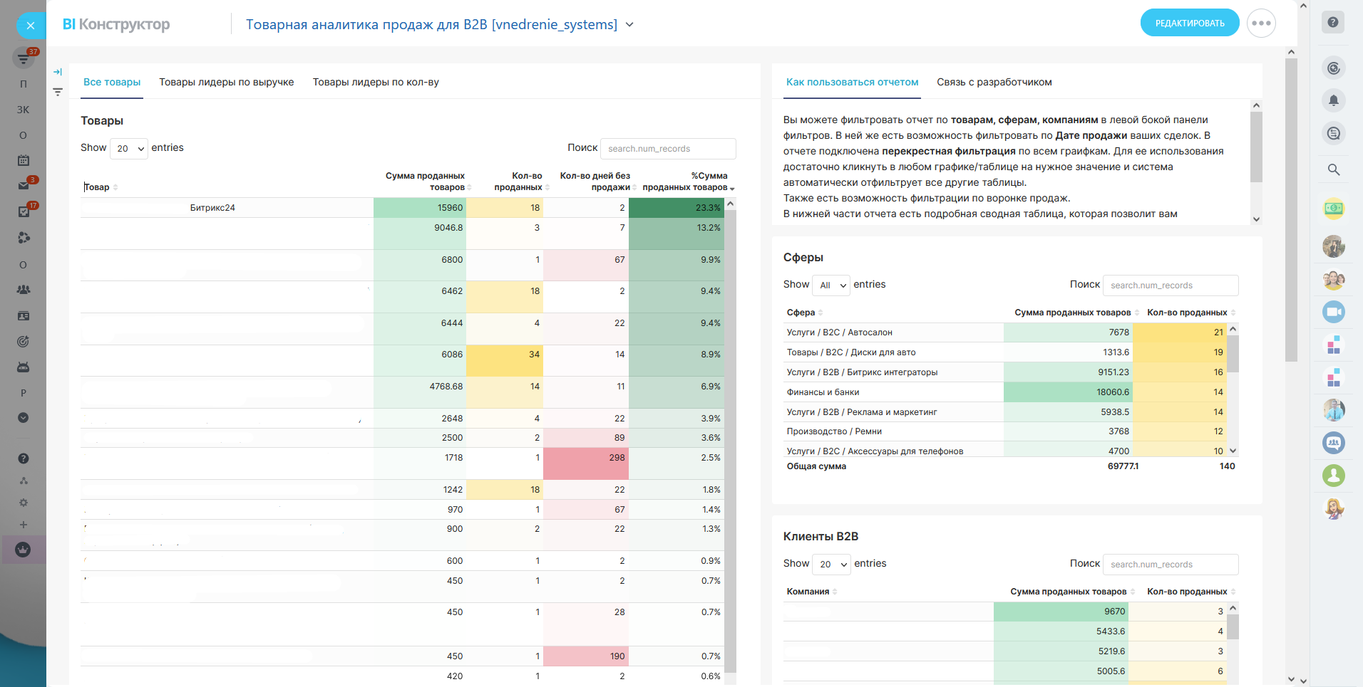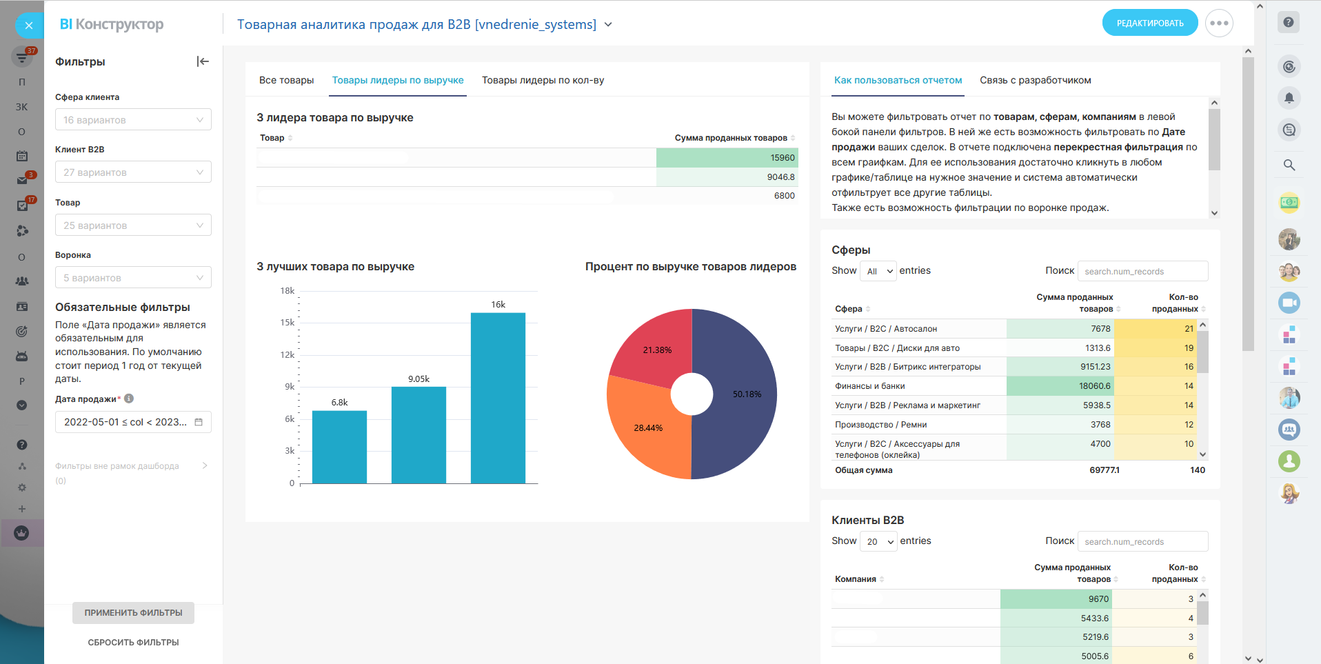 Отчет, показывающий аналитику по вашим товарам, сферам, и B2B клиентам