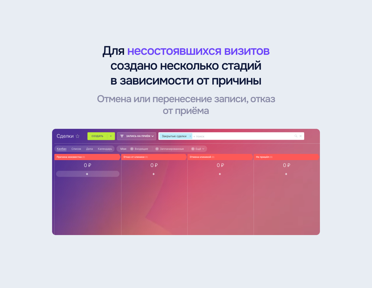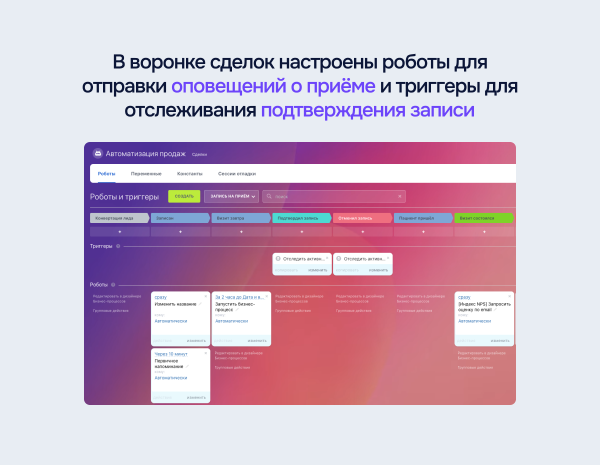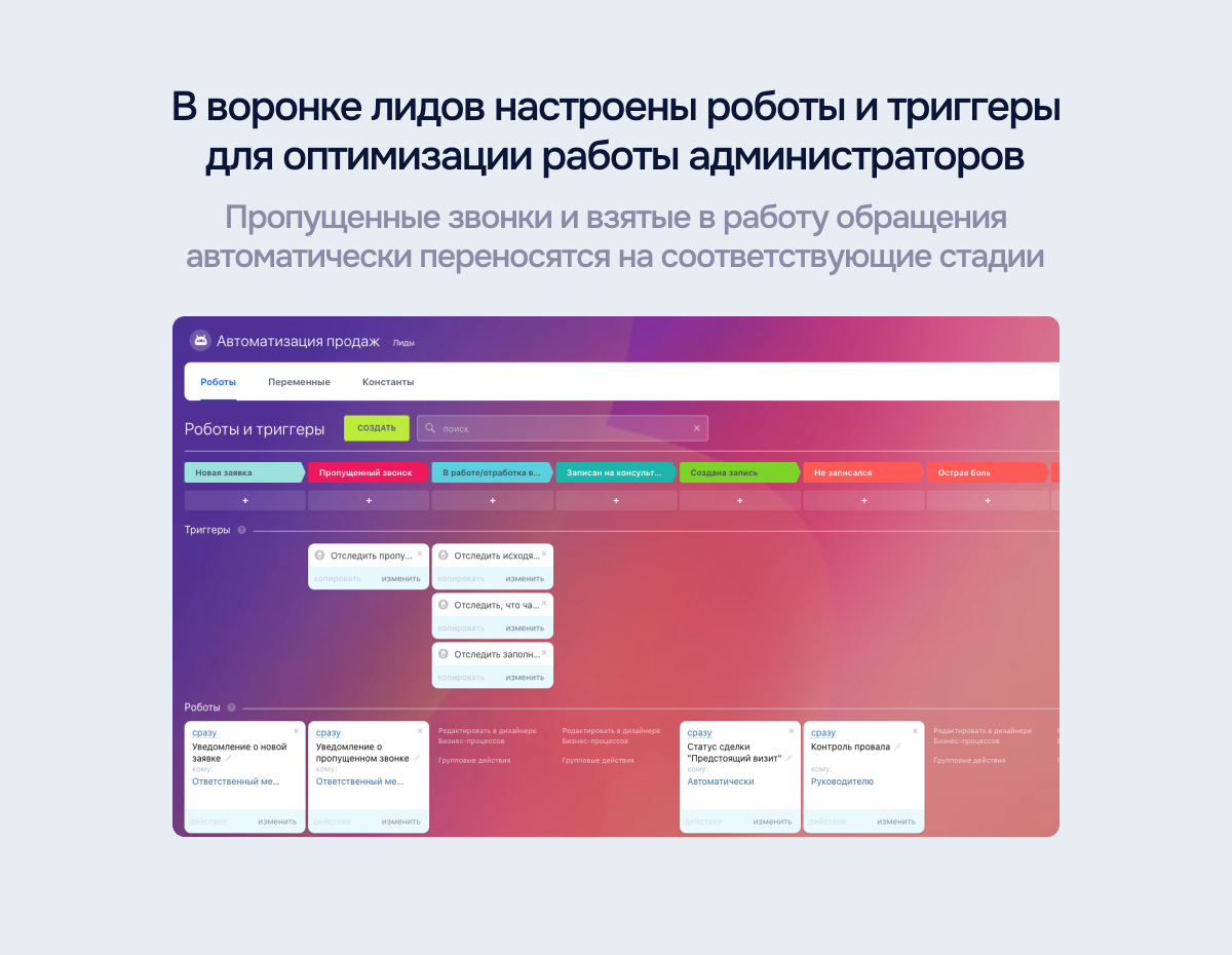 Для провальных стадий предусмотрен робот, которые меняет тип приема: уже записан, обзвон базы, острая боль и отправляется уведомление руководителю: