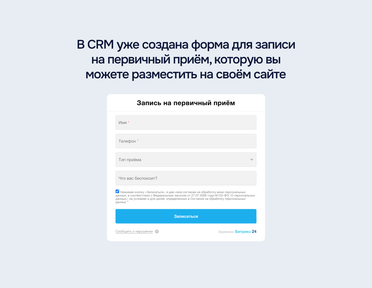 Если пациент хочет записаться, необходимо перенести лид на стадию «Записан на консультацию/приём», после чего создать соответствующую запись в IDENT (если есть интеграция с МИС). Это нужно для того, чтобы при синхронизации данных лид прикрепился к нужной сделке и протягивался источник привлечения пациента.
