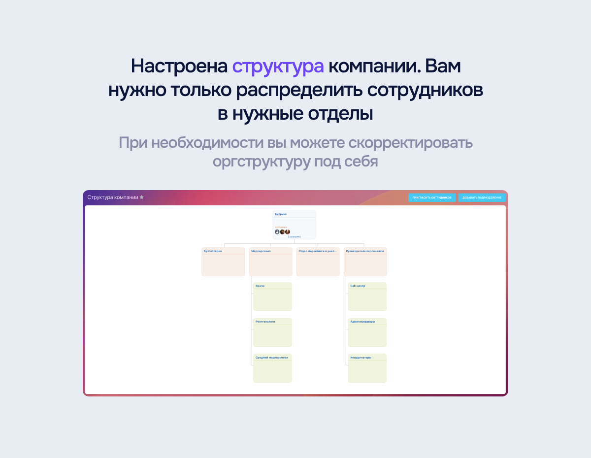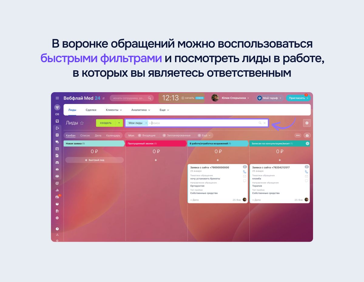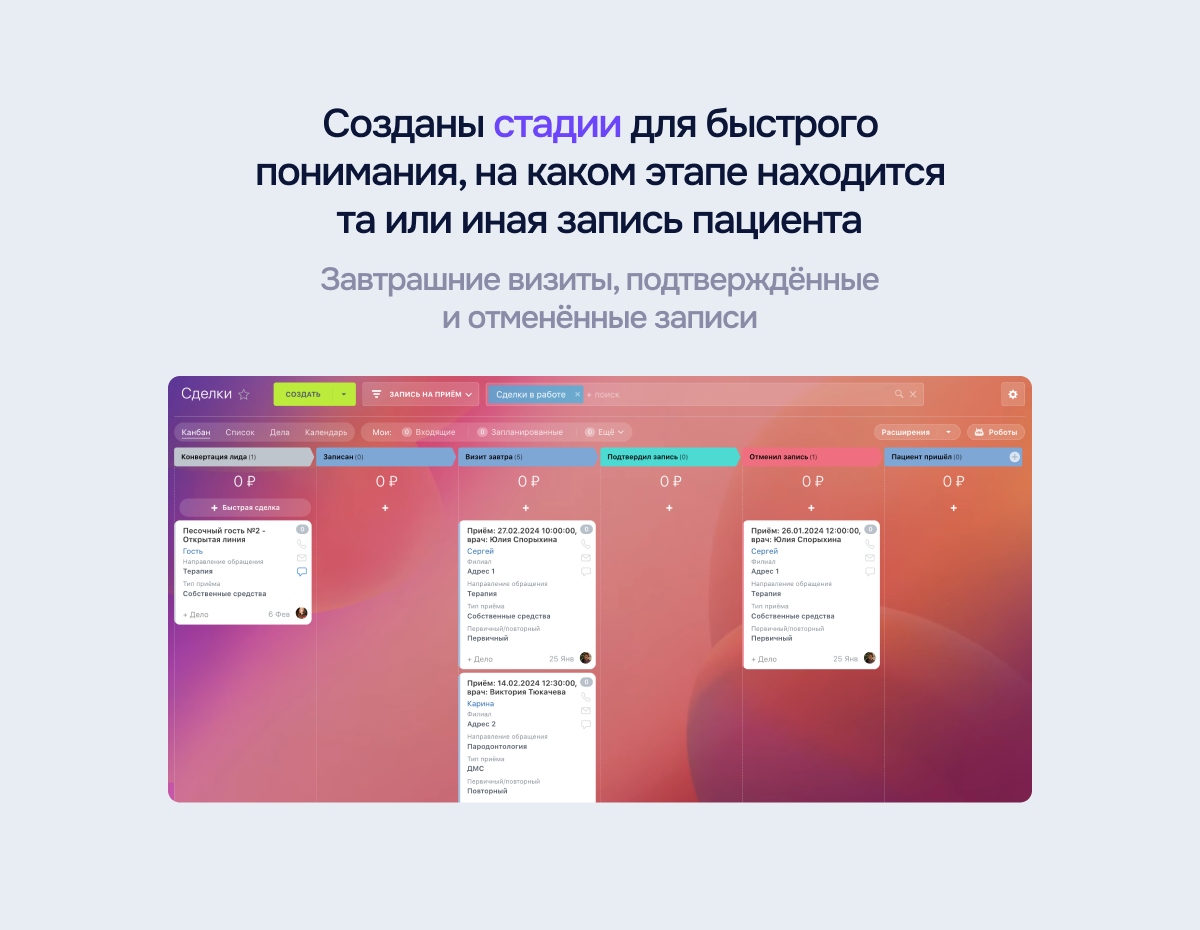Готовая CRM для медицинских центров и стоматологий. Мы сделали всё за вас! На основе опыта общения с владельцами и коммерческими директорами более 10 клиник мы разработали сценарий работы, который позволит вам увеличить эффективность персонала в 1,5–3 раза уже через несколько дней. Что вы получите: запись пациентов на приём; контроль явки пациента на приём; регистрация пациента на ресепшене; приём врача; сдача анализов; сбор обратной связи. И всё это — без лишних телодвижений! С нашей CRM вы сможете забыть о рутине и сосредоточиться на главном — заботе о пациентах.