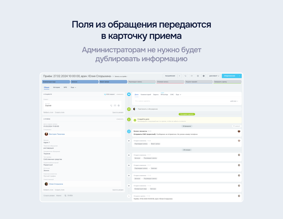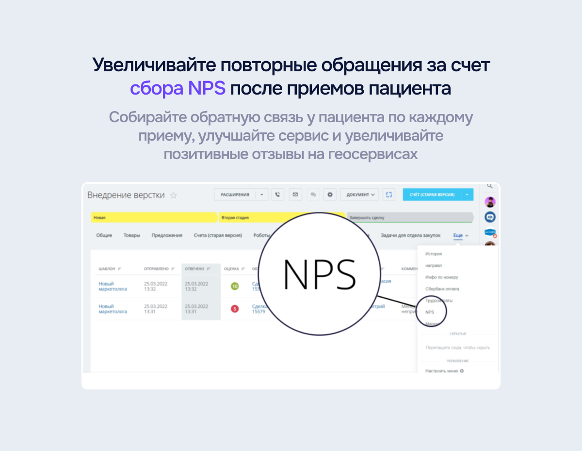 Когда завершится прием, сделка переходит в успешную стадию, передается сумма визита и отправляется NPS клиенту для сбора обратной связи по проему и оказанной услуги. Если пациент ставит позитивную оценку, система автоматически предлагает оставить отзыв о клинике на нужном геосервисе!