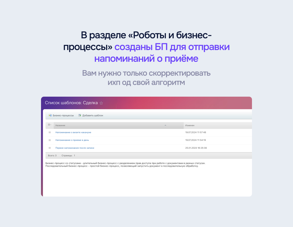 Далее сделка перемещается на стадию «Записан». За сутки до приёма сделка переходит на стадию «Визит завтра», где запускаются автоматические уведомления о визите с обратным ответом (сервис Мобилон по умолчанию).