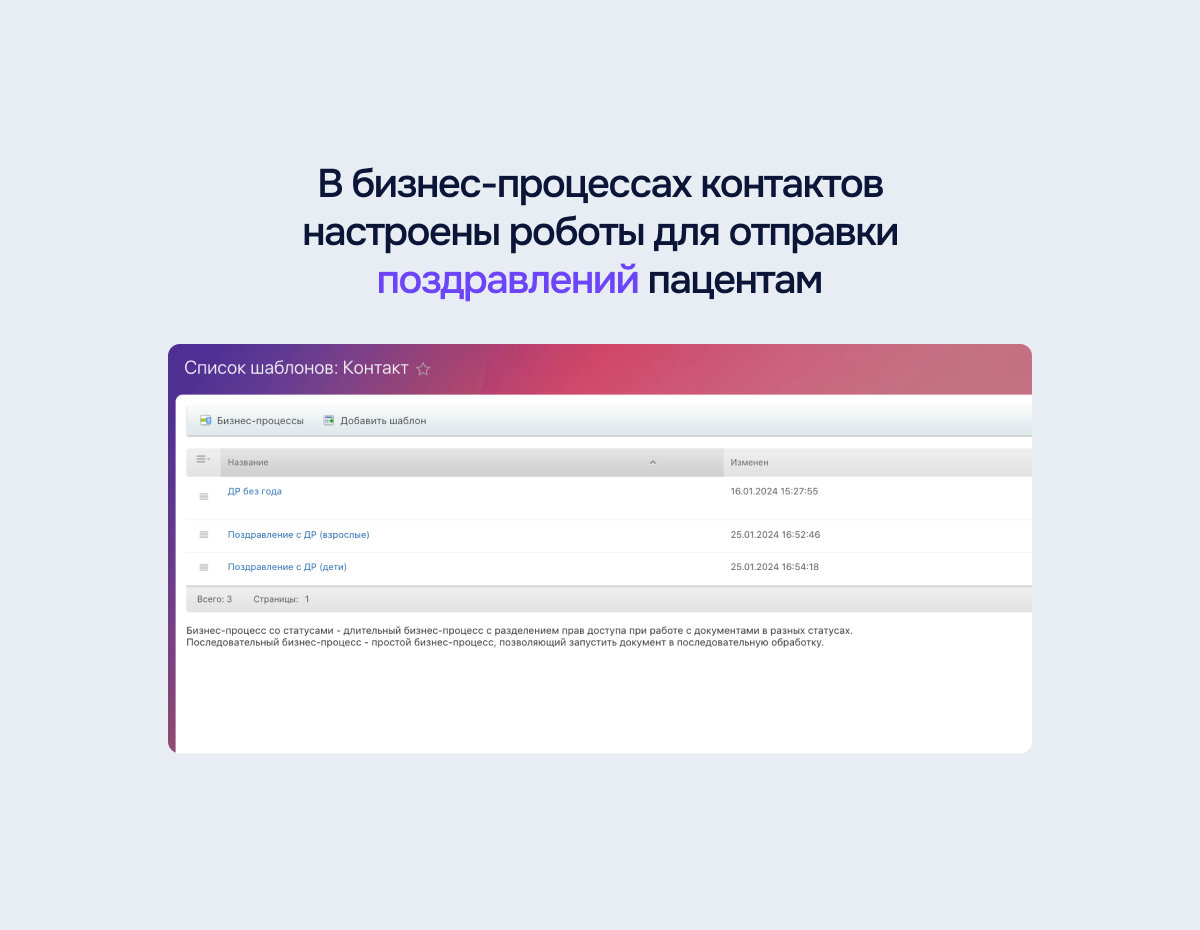 - Пол - в поле выбирается пол пациента (муж или жен) для дальнейшей работы с поздравлениями и сегментации пациентов;