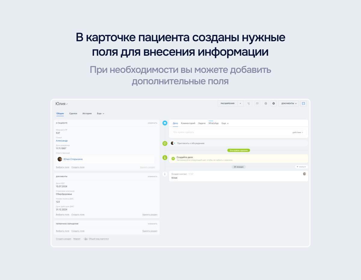 - Медкарта № - в поле указывается номер медицинской карты пациента, так же используется для интеграции с МИС;