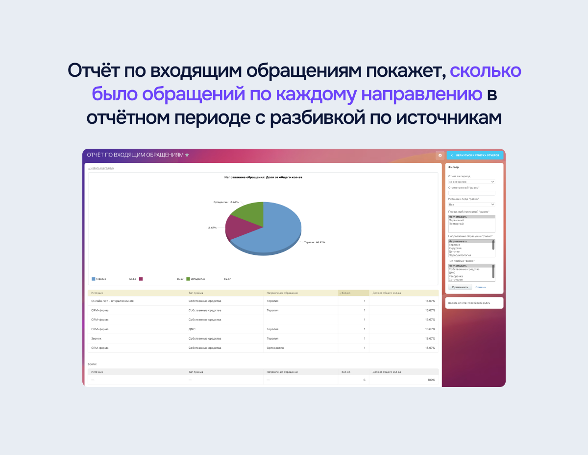 - Направление обращения - указывается направление обращения (Терапия, Хирургия, Детство, Пародонтология, Имплантация, Ортодонтия, Ортопедия и тд);