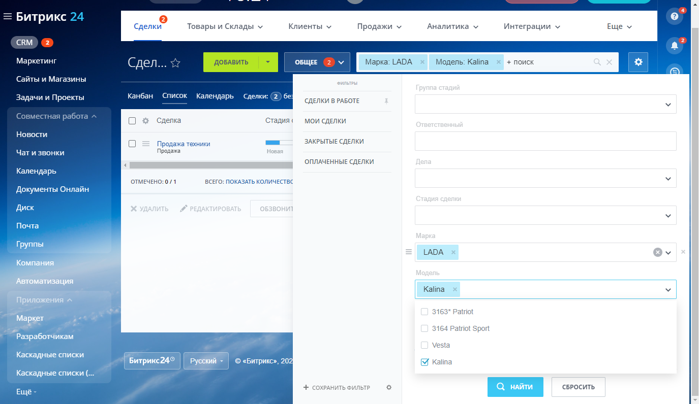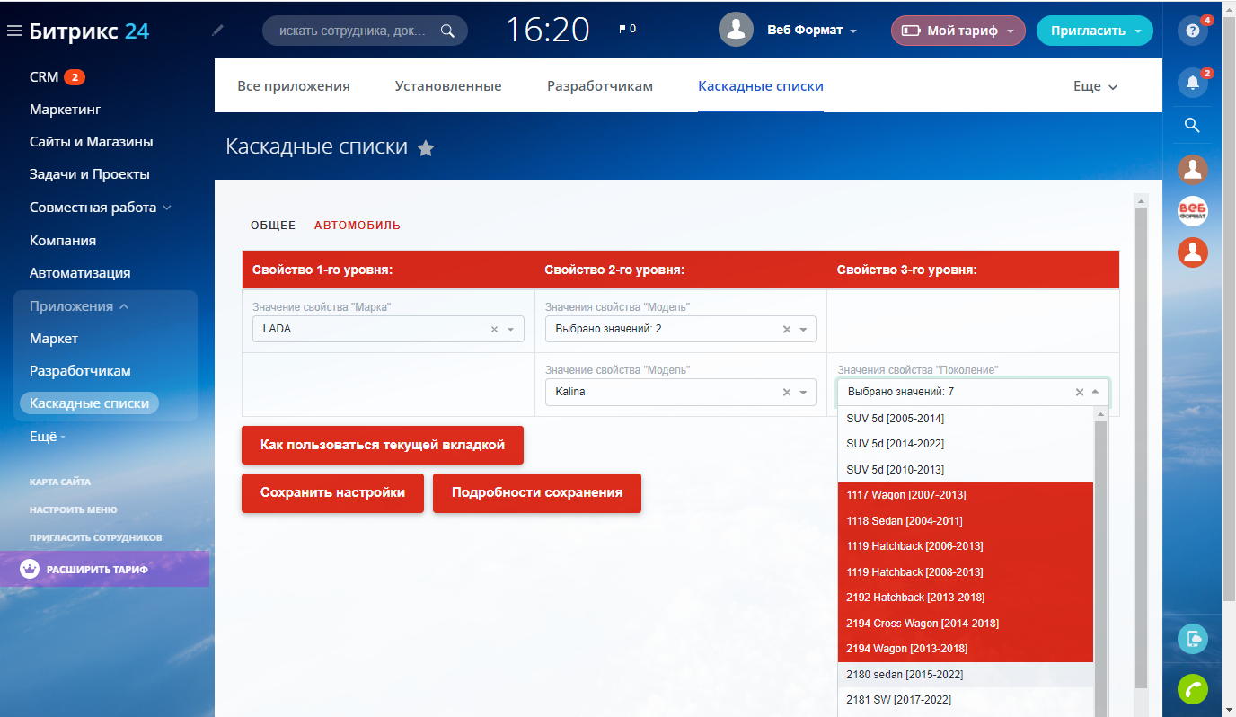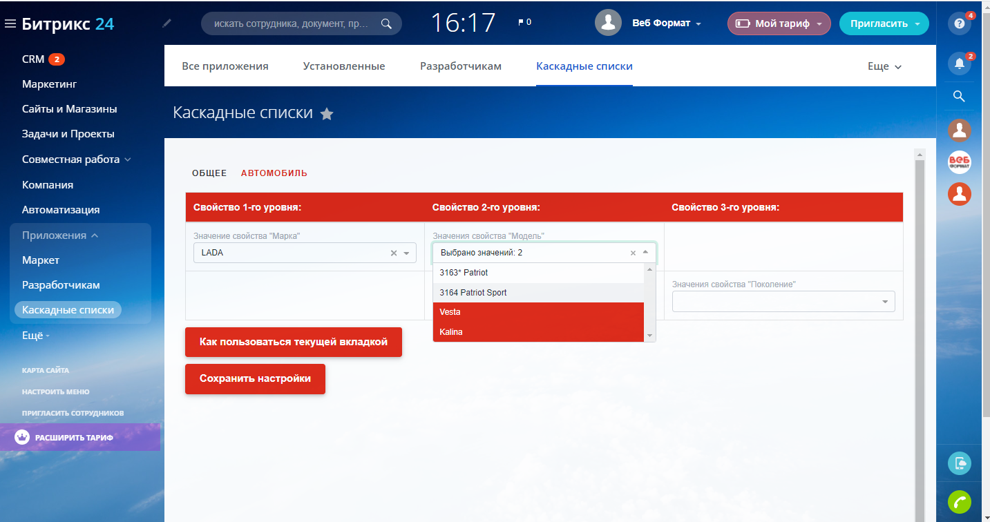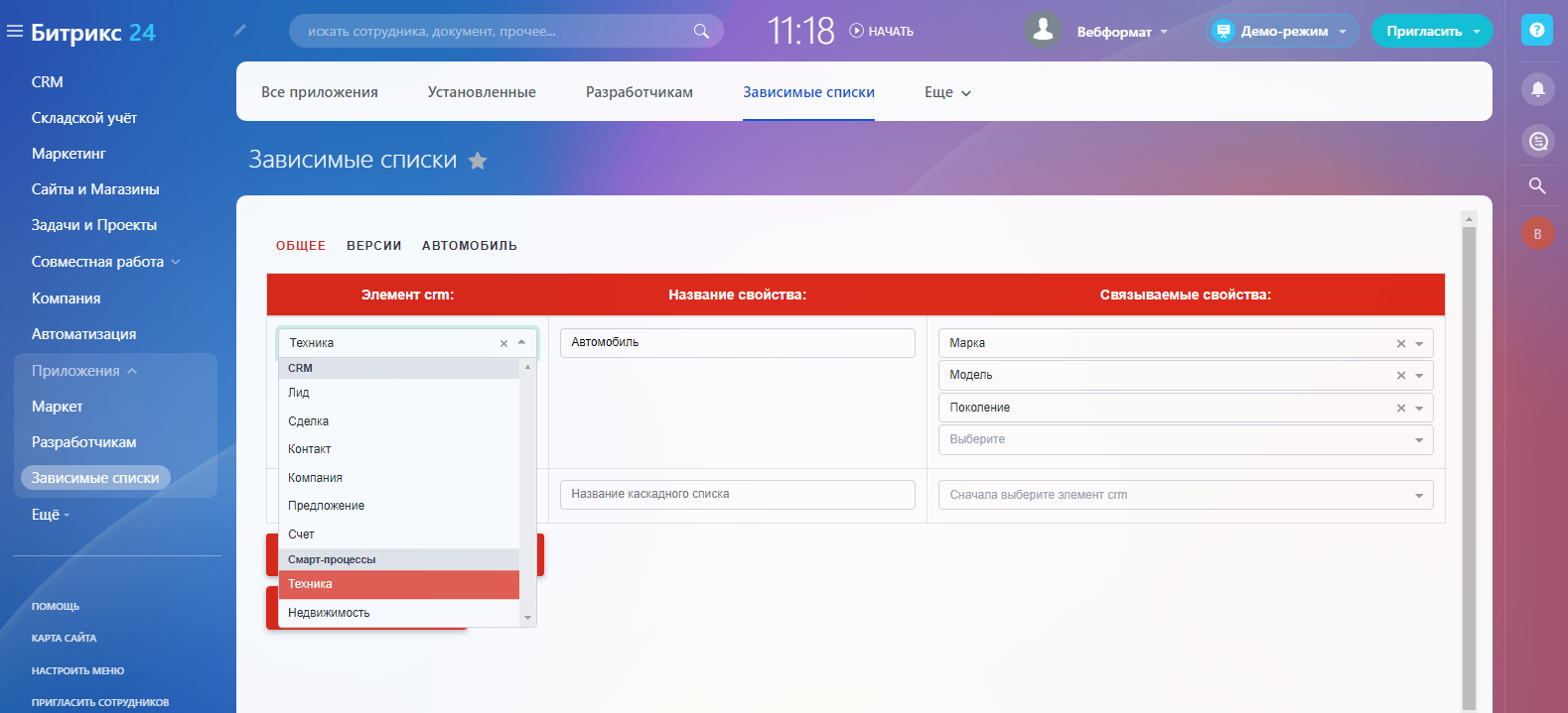 Настройка списка и карточки элементов crm для использования каскадного списка