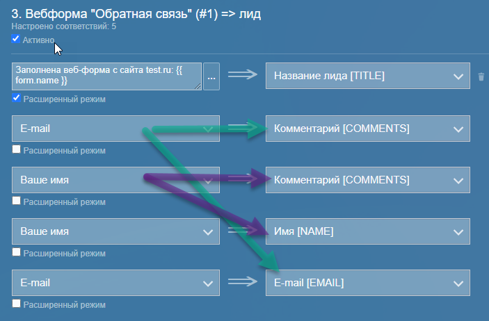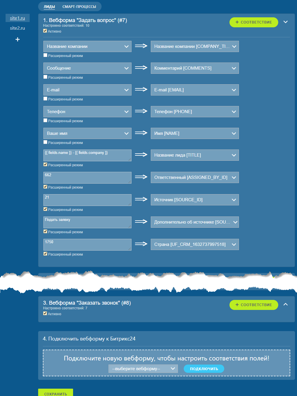 - Гибкая настройка соответствий полей (можно грузить несколько полей веб-формы в одно поле лида; можно грузить текстовые свойства в списки с автоматическим созданием недостающих значений в списках Битрикс24);