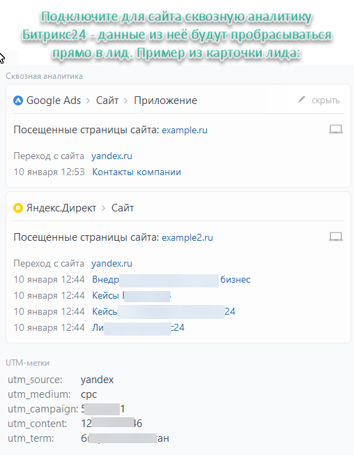 - Проброс сквозной аналитики (в лидах будет заполняться список посещённых пользователем страниц на вашем сайте) – для этого требуется подключить на сайт сквозную аналитику Битрикс24;
