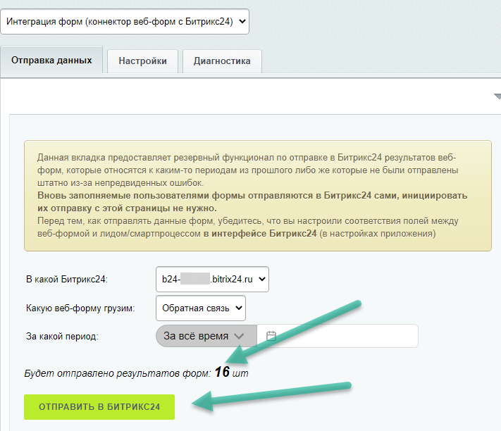 - Возможность ручного запуска выгрузки веб-форм в Битрикс24 (по фильтру);