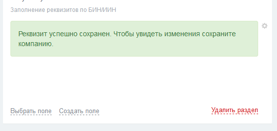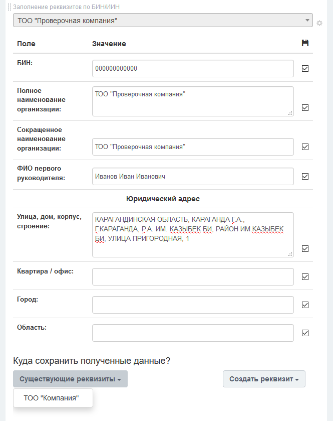 Таким образом, вы получаете возможность искать реквизиты компаний по БИН/ИИН, сохранять эти реквизиты или изменять уже имеющиеся.