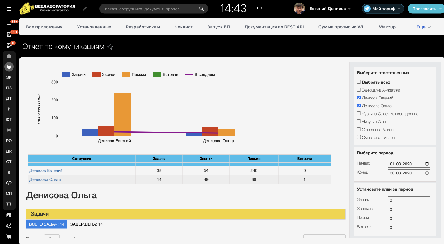 Единый отчет по задачам, звонкам, письмам и встречам с возможностью рачета план-факта по сотрудникам и детальным просмотром информации по каждому сотруднику.