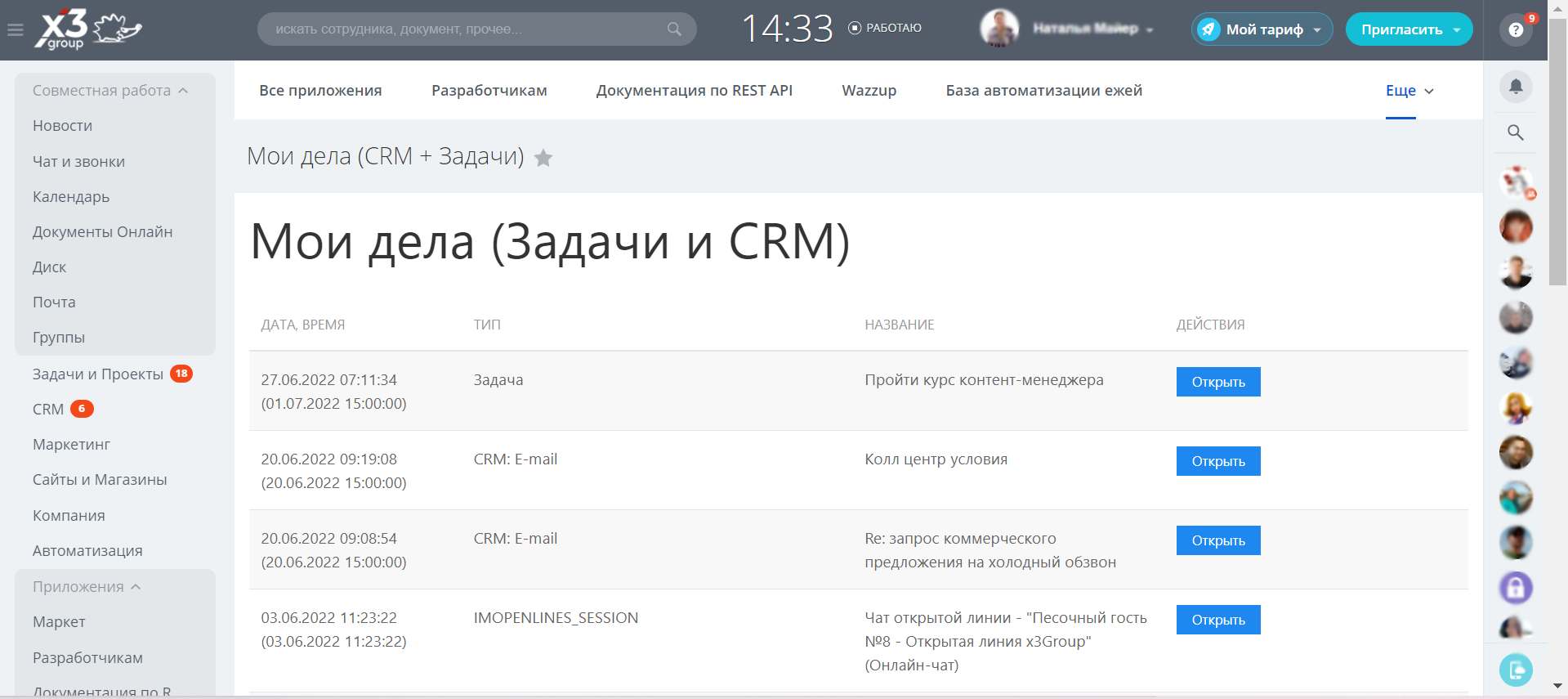 Активно используете модули CRM и Задачи и Проекты на Битрикс24? Хотели бы видеть все события из CRM и Задач на одной странице? Пожалуйста! Скачайте и установите специальное приложение для Битрикс24 «Мои дела (CRM + Задачи)» и пользуйтесь единым списком задач и дел из CRM.