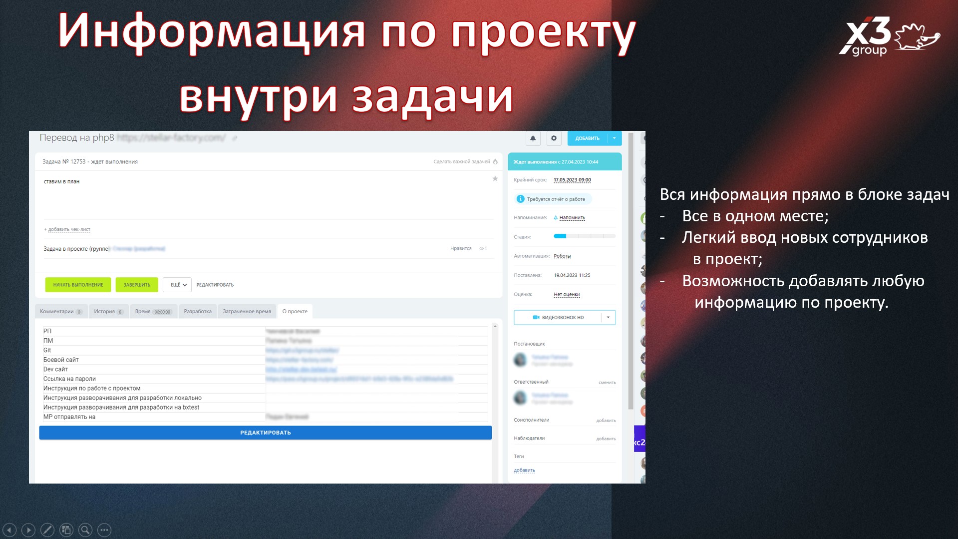 Наше приложение позволяет легко передавать проекты от одного сотрудника к другому, формировать до 7 различных отчетов по проектам, добавлять отдельную вкладку в блок задач для хранения основной информации по проекту и возобновлять отложенные задачи в указанный срок.