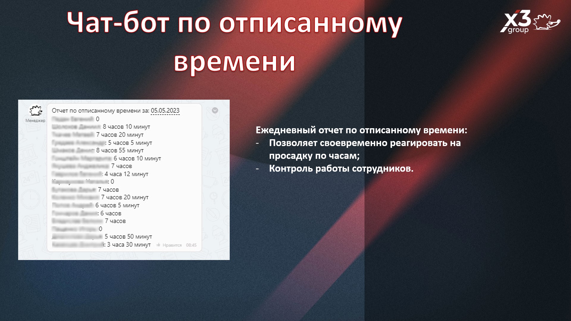 Чат-бот предоставляет ежедневный отчет по отписанному времени, а интеграция отписанного времени в отчет позволяет ПМ увидеть отписанное время сотрудников. (Отписанное время - это время, которое сотрудник отписывает на выполнение задачи. Иными словами отписанное = затраченное время сотрудником на выполнение задачи, которое он "отписывает" в специальном блоке, задач)