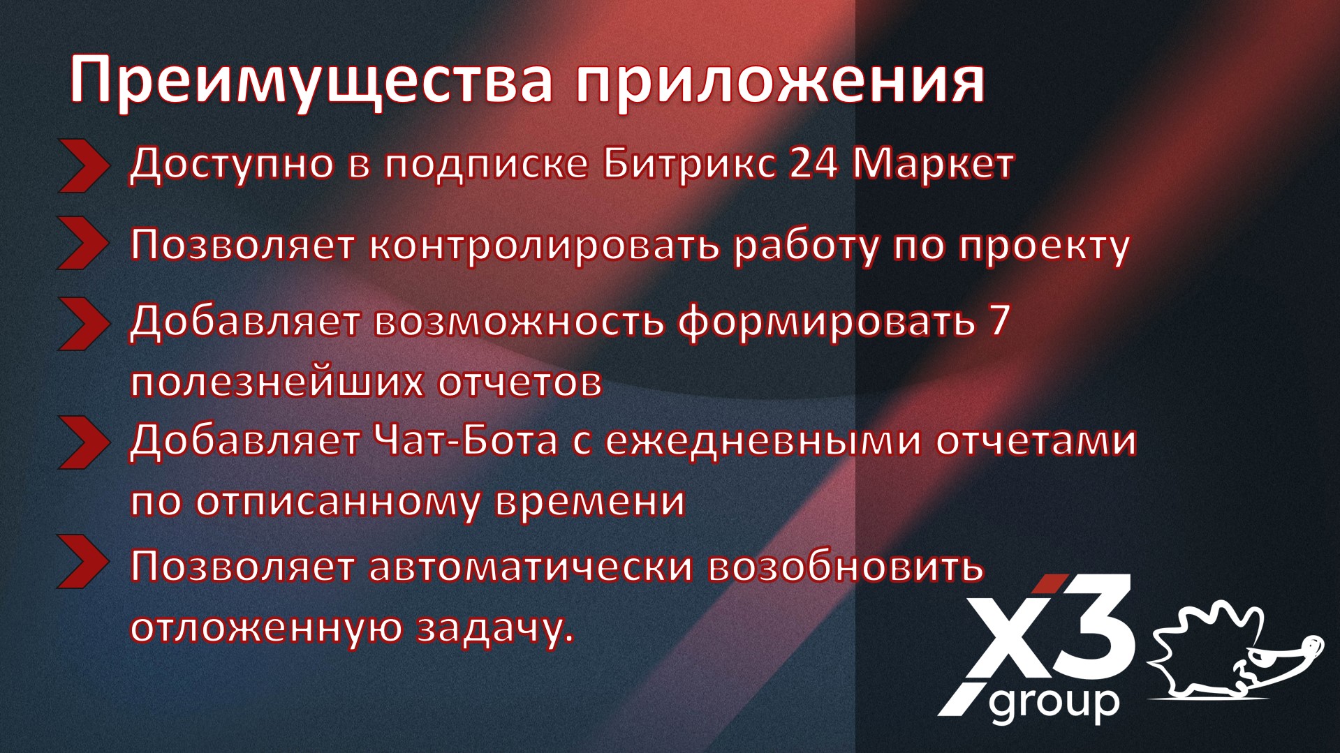 Прокачайте управление проектами с нашим приложением! Приложение облегчит работу по проектам и задачам, добавив такой инструментарий как: - Формирование 7 разных отчетов по проекту и задачам (включая отчеты с отписанным временем) - Вкладка в задачах "О проекте" - Возобновление отложенной задача в указанный срок - Чат-Бот, предоставляющий ежедневный отчет по отписанному времени