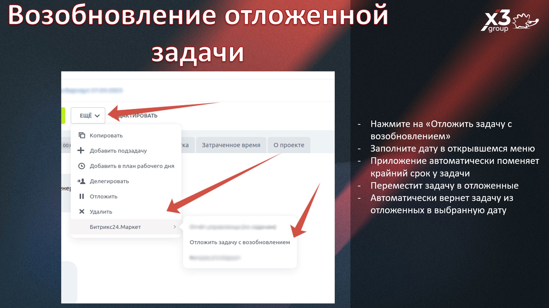Указываете дату, откладываете задачу, когда подойдет выбранная дата, задача будет возобновлена в работу.