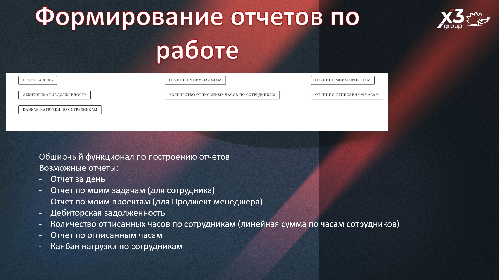 1) Интегрирует отписанное время(Отписанное время - это время, которое сотрудник отписывает на выполнение задачи. Иными словами отписанное = затраченное время сотрудником на выполнение задачи, которое он "отписывает" в специальном блоке, задач) в отчет: