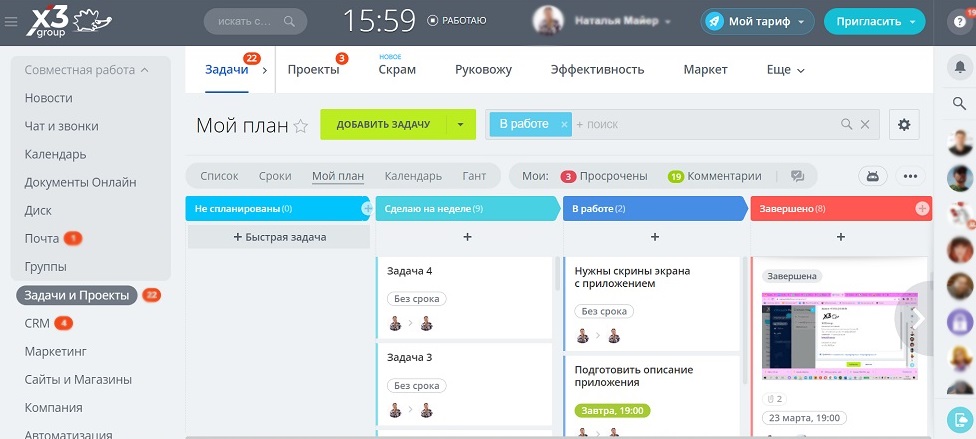 Слово «канбан» по-японски означает «рекламный щит, вывеска». В Битрикс24 канбан реализован в виде виртуальной онлайн-доски для работы с проектами и задачами внутри проектов. Онлайн-доска наглядно показывает на каком этапе находится та или иная задача. В зависимости от стадии сотрудники перемещают текущие задачи в соответствующие колонки, настроенные администратором.