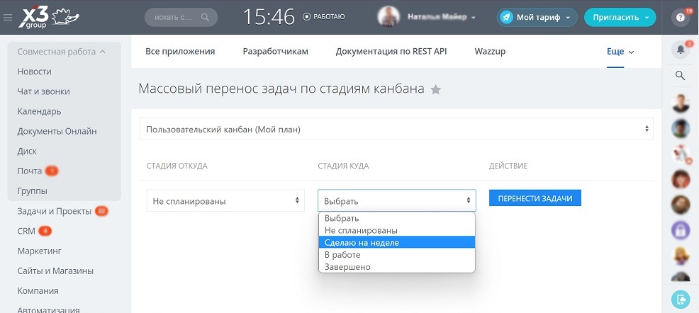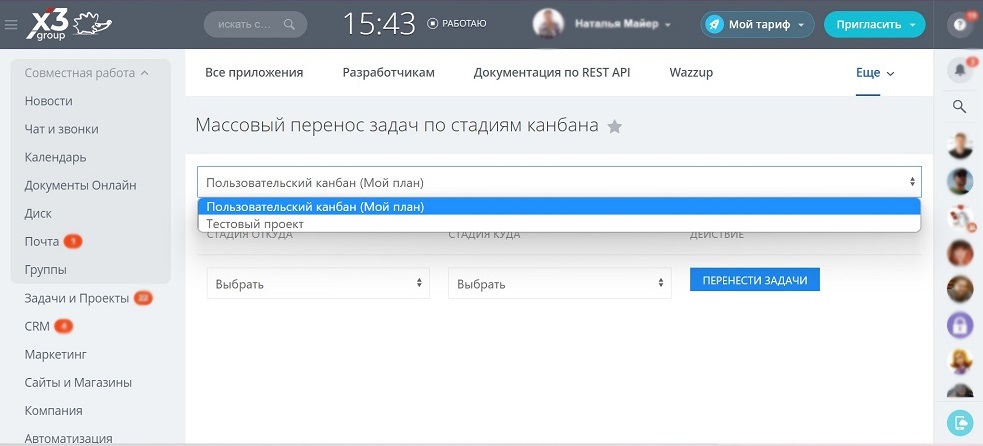 Приложение позволяет выбрать все задачи из конкретного проекта или из «Моего плана» и автоматически перенести их с одной стадии в другую.