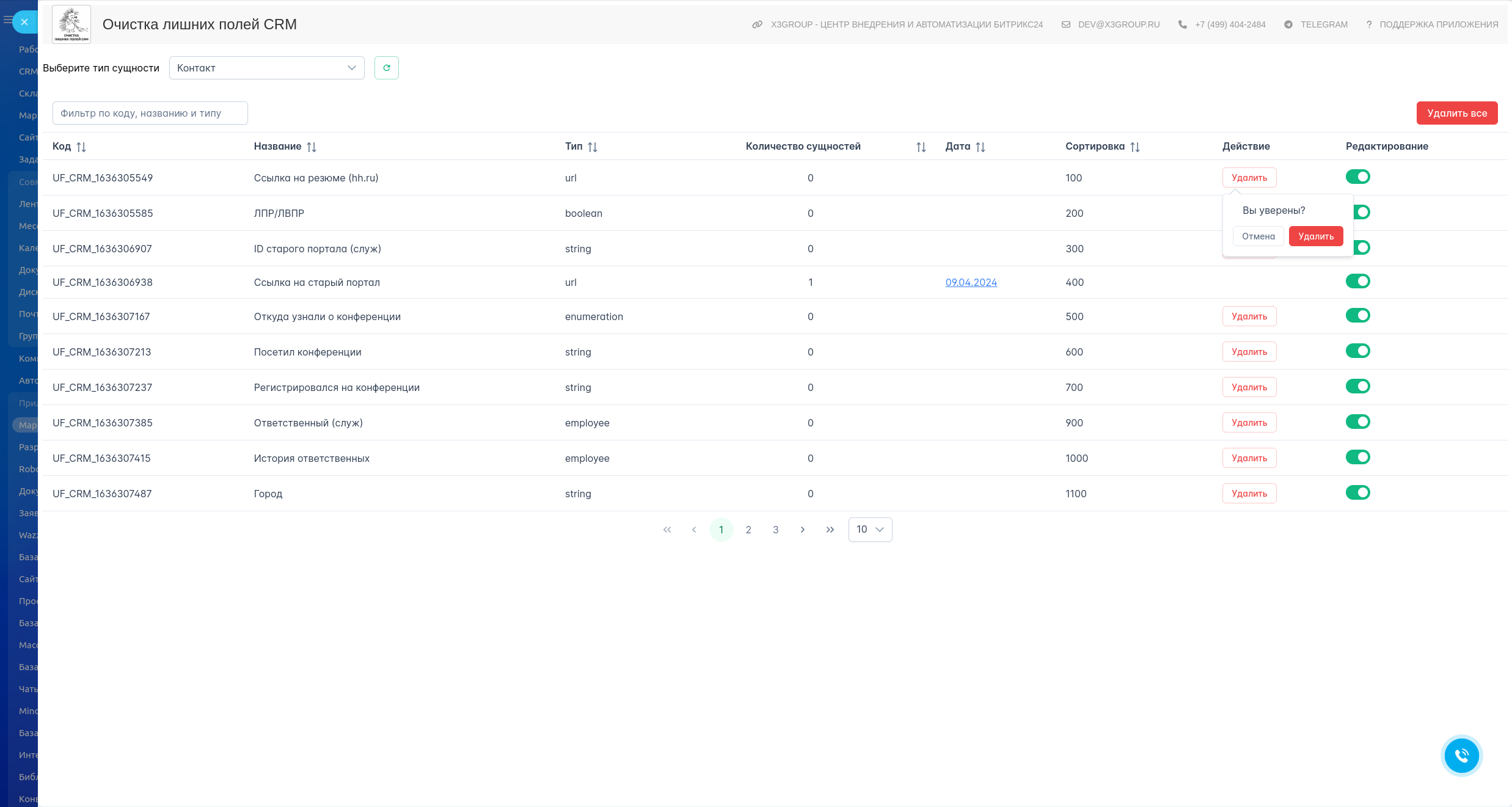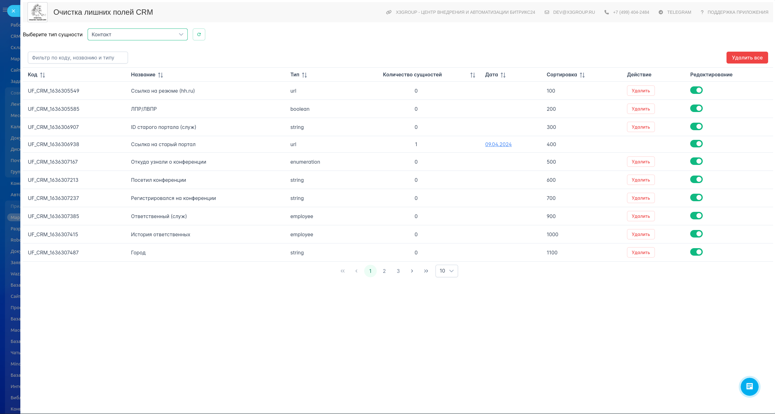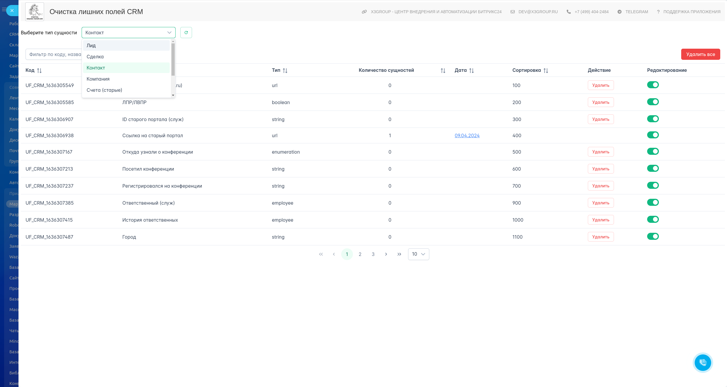 Приложение, предназначенное для управления полями в системе CRM, представляет собой удобный инструмент для интеграторов и администраторов портала. Оно анализирует все поля выбранной сущности, помогая определить лишние и неиспользуемые поля, позволяет быстро переходить к настройкам нужного поля и удалять его.
