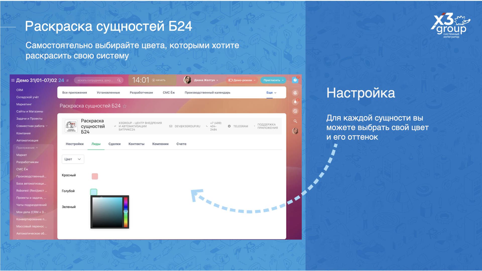 После установки приложения нужно настроить необходимые вам цвета в Приложении Битрикс24.