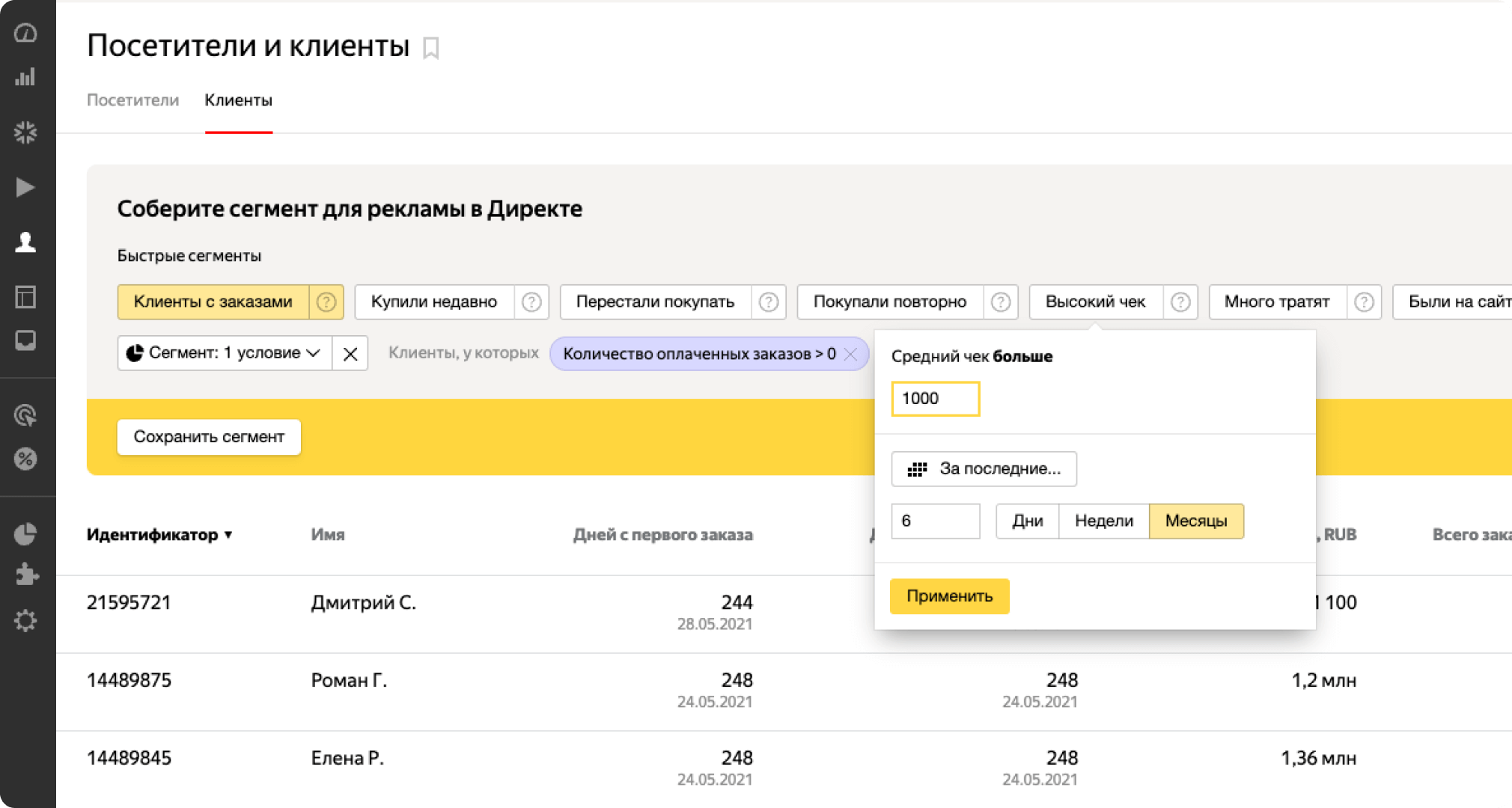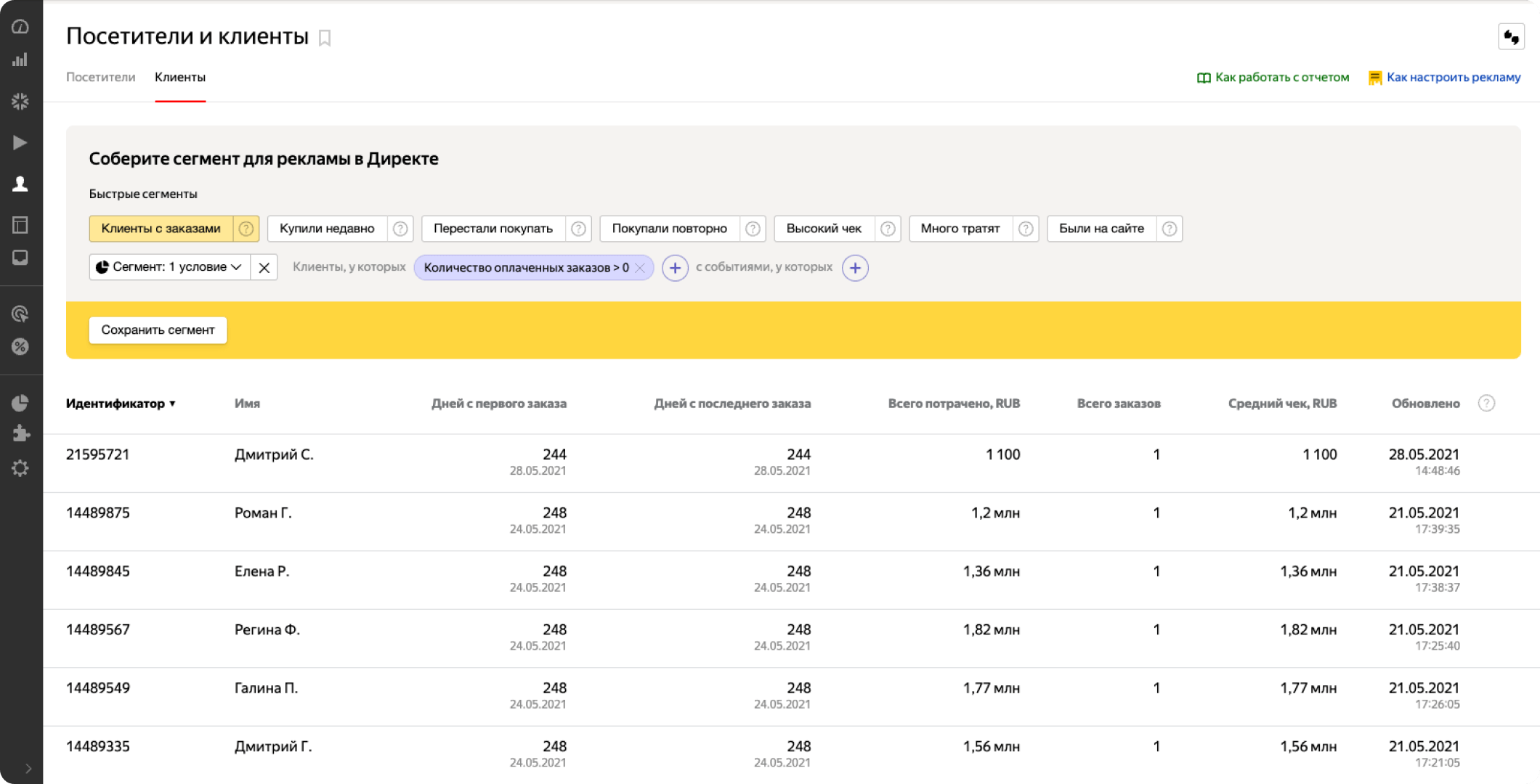 Метрика автоматически соберет сегменты на основе статистики покупок именно ваших клиентов. Задавать условия подбора аудитории для этого не нужно. Используйте сегменты, чтобы привлекать больше клиентов, которые похожи на ваших покупателей с самым высоким чеком, отключать показы тем, кто уже купил определенный товар, и решать другие задачи.