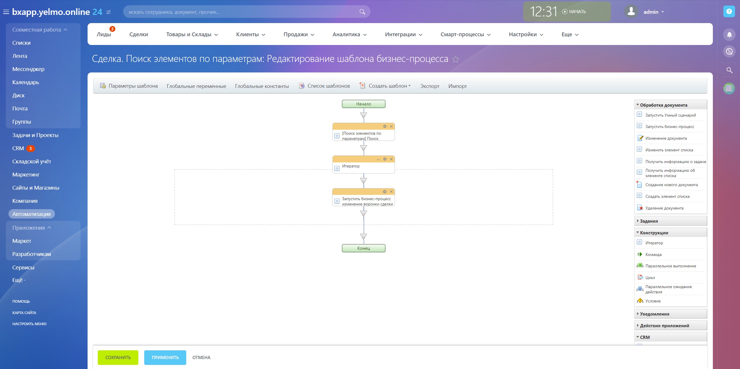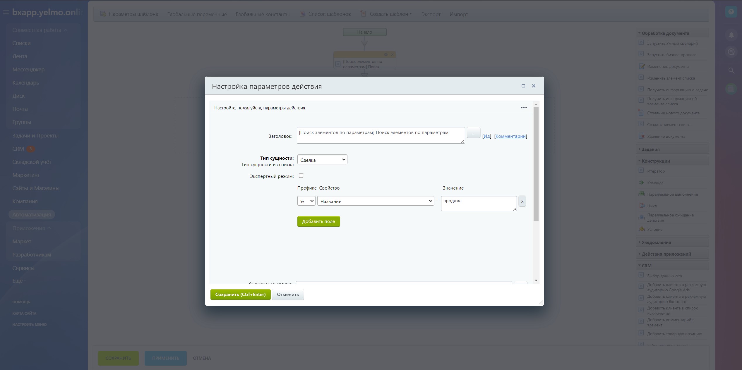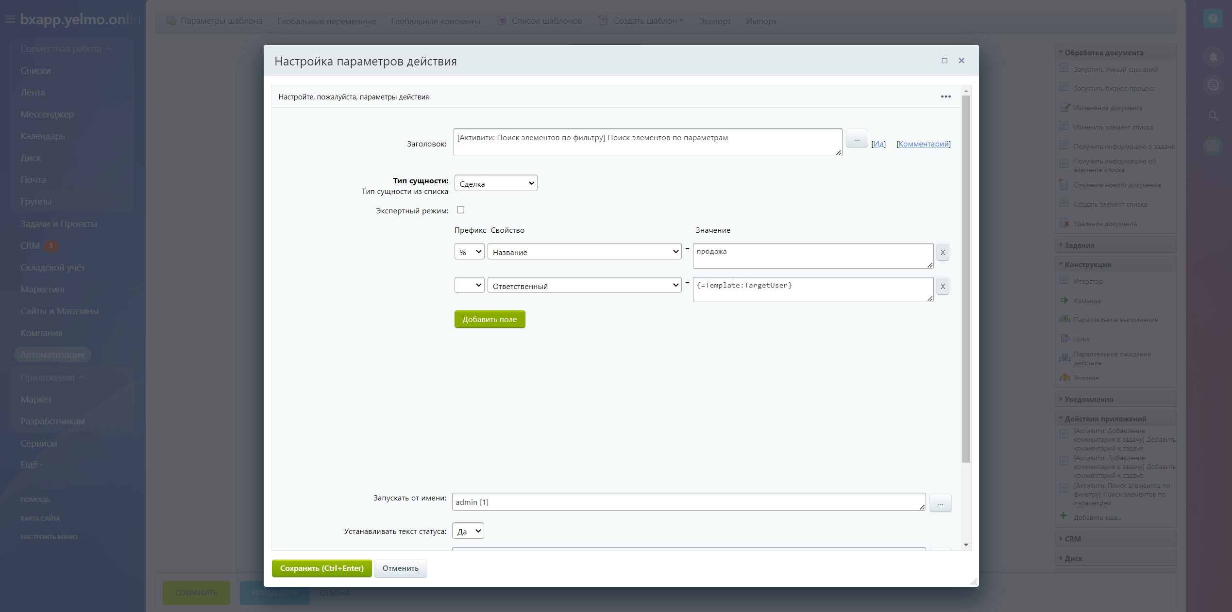 Активити в конструктор бизнес-процессов, позволяющее найти все элементы CRM или универсального списка, по заданным параметрам, для последующей обработки.