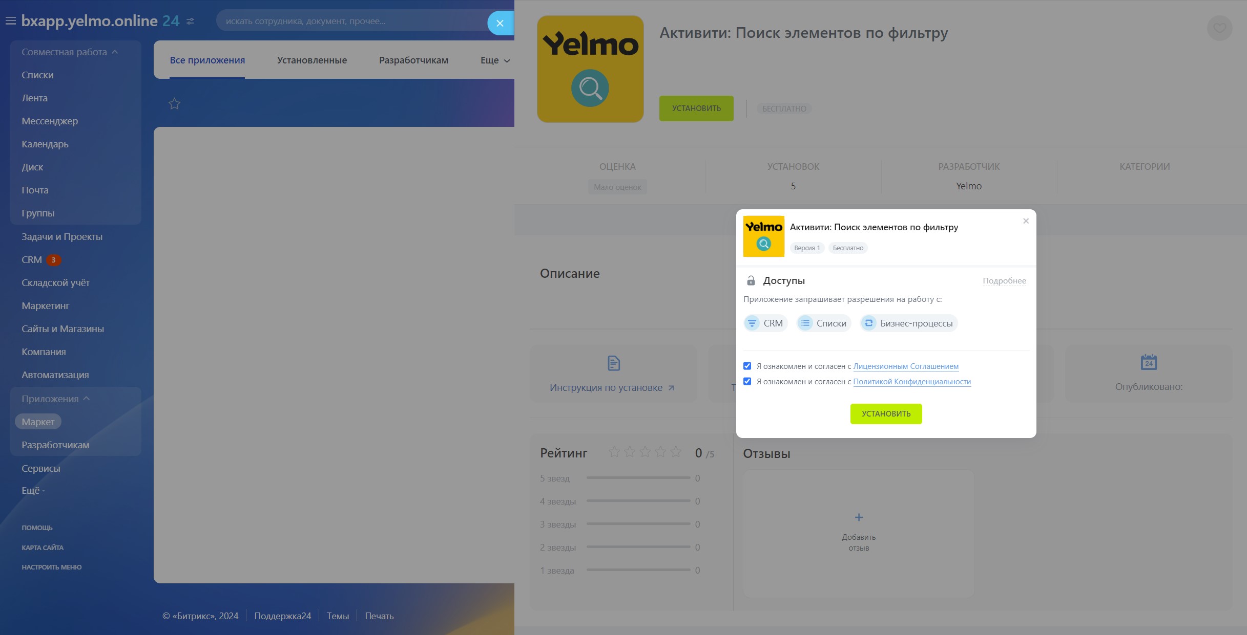 Приложение добавляет в конструктор бизнес-процессов активити, позволяющее, через бизнес-процесс в любой сущности (CRM или универсального списка), найти все элементы по заданному фильтру и передать массив ID найденных элементов в итератор для последующей обработки(массового редактирования).