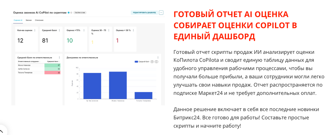 ГОТОВЫЙ ОТЧЕТ AI оценка собирает оценки Copilot в единый дашбордГотовый отчет скрипты продаж ИИ анализирует оценки КоПилота CoPilota и сводит единую таблицу данных для удобного управления рабочими процессами, чтобы вы получали больше прибыли, а ваши сотрудники могли легко улучшать свои навыки продаж. Отчет распространяется по подписке Маркет24 ине требует дополнительных оплат.