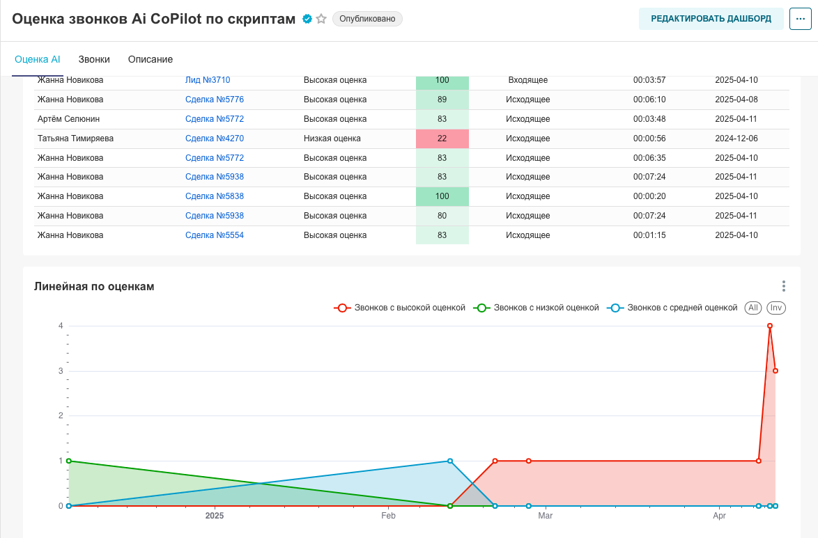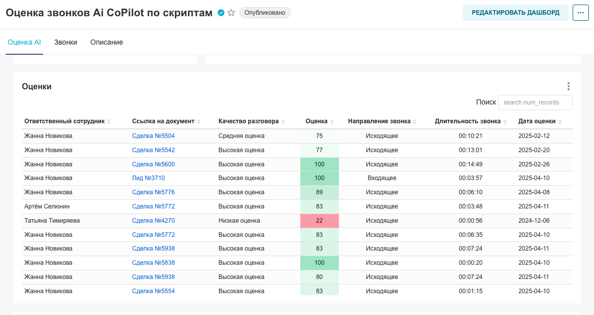 Дашборд и готовый отчет Bi собран на основе оценок CoPilot по вашим скриптам. Ai Копилот анализирует звонок по скрипту и дает обратную связь. Поможет руководителю Отдела продаж, менеджерам и сотрудникам повышать продажи и лояльность клиентов. Скрипты встроены и легко редактируются в вашем Битрикс24.