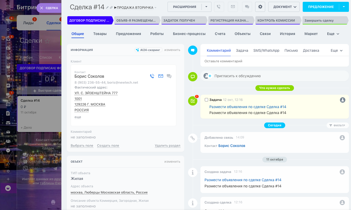Готовая CRM подойдет агентствам недвижимости, риелторским компаниям, которые оказывают услуги по подбору новостроек, продаже и покупке вторичной недвижимости. Готовая CRM включает в себя все последние новинки Битрикс24. Всё готово для работы: нужные поля, данные, воронка лидогенерации, воронка подбора новостроек, воронка подбора вторички, воронка продаж, база данных по объектам.