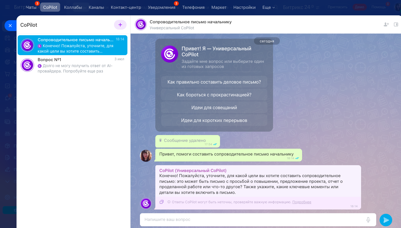 2. Запустите ИИ чат в Битрикс (иконка ИИ в левом меню) смотреть скрин