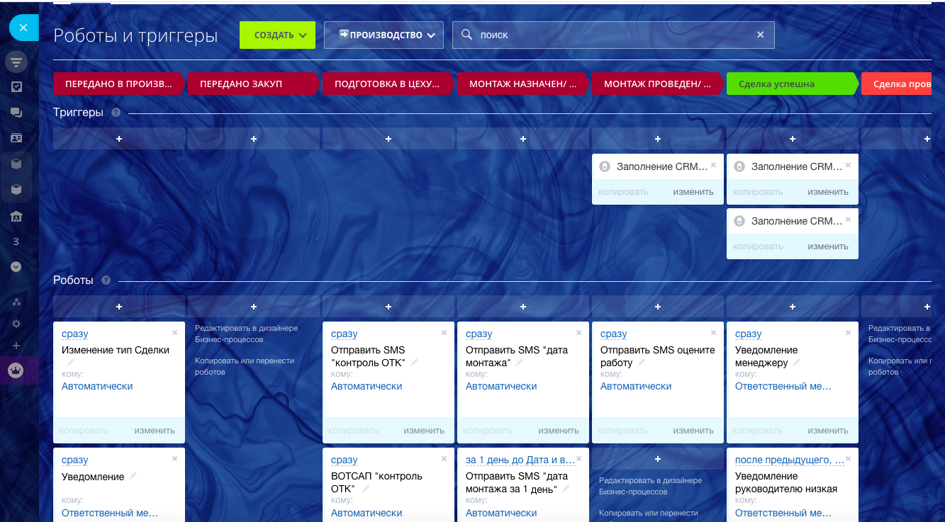 Подходит для процесса продажи, монтажа и обслуживания натяжных потолков. Данное решение включает в себя все последние новинки Битрикс24. Все готово для работы: нужные поля, данные, воронка продаж, воронка производства, воронка доп. продаж, складской учет.