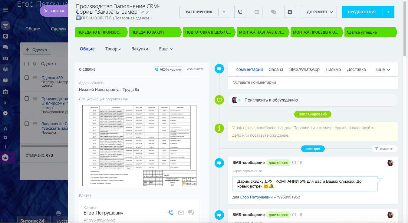 CRM Натяжные ПОТОЛКИ помогает работать как компании внутри, так и с клиентами в автоматическом режиме. В данном решении корректно учтены все этапы для правильного расчета конверсии, контроля менеджеров и отработки рекламного бюджета! Автоматические Вотсап и смс сообщения удерживают клиента, пока он особенно горячий, в течение 7 дней. Мы стремимся свести к минимуму трудозатраты и человеческий фактор. Готовая CRM прекрасно справляется с этой задачей!