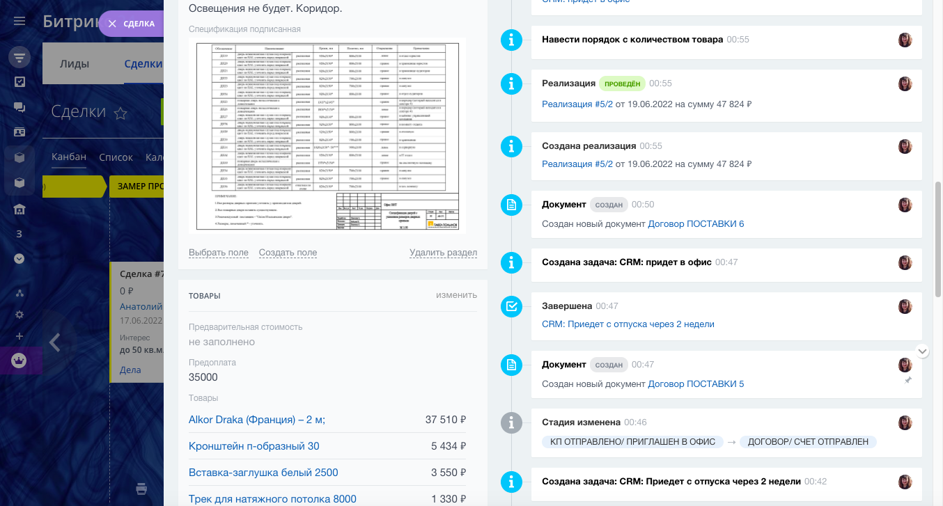 Отраслевая CRM натяжные потолки включает в себя все последние новинки Битрикс24. Складской учет поможет корректно вести остатки на складе, планировать комплектующие для производственного цикла. В ГОТОВУЮ CRM Натяжные ПОТОЛКИ можно добавить: